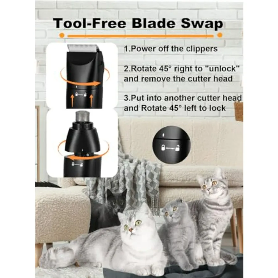 Tool-Free Blade Swap: 1.Rotate Right 45° to align the blade’s mark with the unlock symbol,Lift Up to remove the blade. Insert the new blade into the slot,Rotate Left 45°to the lock symbol. The cat grooming kit's self-aligning design clicks securely – no forced twisting!